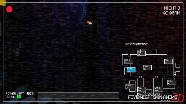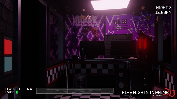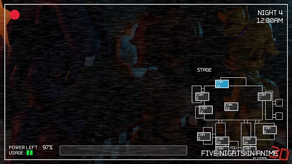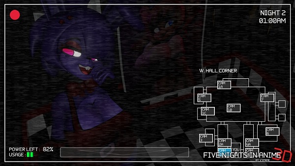 Five Nights in Anime 3D mantiene la clásica fórmula de “point and click”. El jugador controla cámaras de vigilancia, cierra puertas y gestiona la energía limitada para sobrevivir hasta las 6 a.m. Cada acción requiere estrategia: gastar demasiada energía deja al jugador vulnerable.